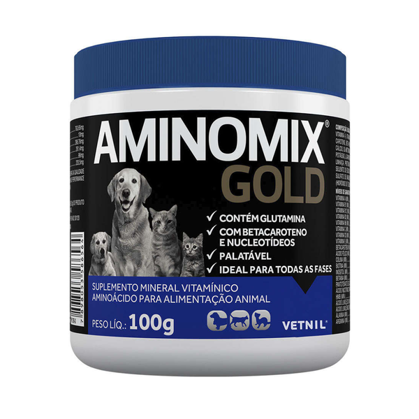 Aminomix Gold é um suplemento vitamínico-mineral e aminoácido super premium, fabricado pela Vetnil.