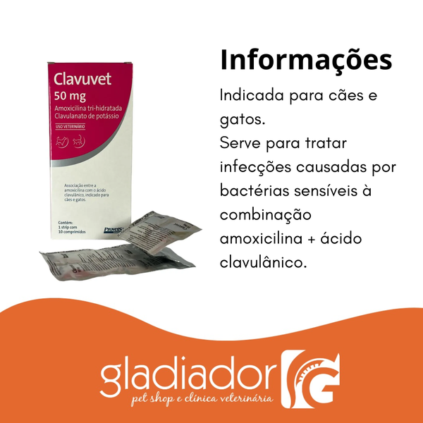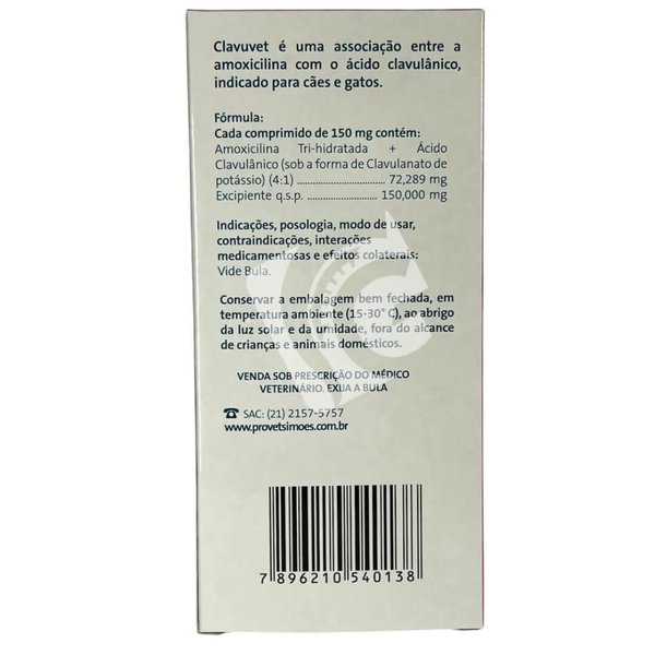 Clavuvet é um antibiótico veterinário da Provets, formulado com amoxicilina e ácido clavulânico para tratar infeções bacterianas em cães e gatos, combatendo bactérias como E. coli, Salmonella e Staphylococcus. A sua fórmula é de amplo espectro e a dosagem, frequência e duração do tratamento devem sempre ser definidas e supervisionadas por um médico veterinário.