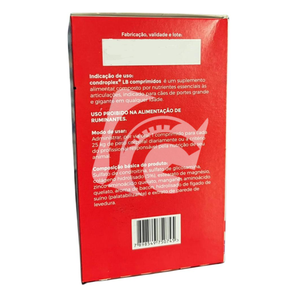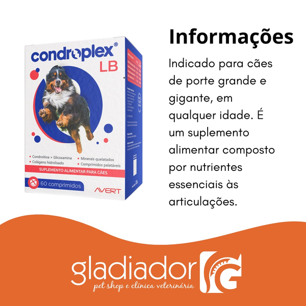O Condroplex é um suplemento alimentar veterinário que serve para a saúde e manutenção das articulações de cães, sendo indicado para casos de desgaste articular, lesões, doenças degenerativas (como artrite e artrose) ou para prevenir problemas em animais idosos, com atividades físicas intensas, obesos ou em fase de crescimento. O produto contém glicosamina, condroitina e colágeno hidrolisado, que auxiliam na formação e recuperação da cartilagem.