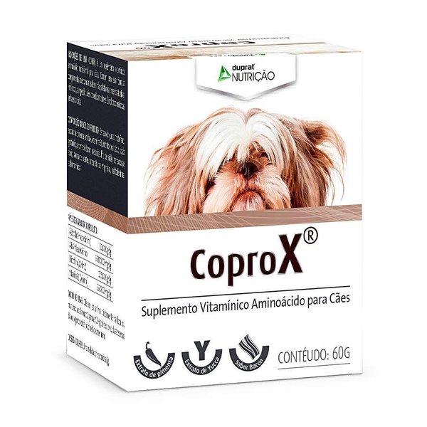 COPROX é um suplemento Vitamínico aminoácido nutricional para cães. Contém em sua fórmula componentes que tornam as fezes menos atrativas e pouco palatáveis, inibindo sua ingestão, além de reduzir o stress. É indicado em todas as fases da vida do cão