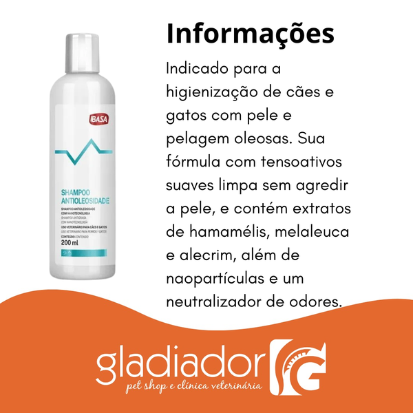 O Shampoo Antioleosidade é indicado para higienização de cães e gatos com pele e pelagem oleosas. Possui tensoativos suaves que promovem limpeza sem agredir a pele. Conta com nanopartículas e com neutralizador de odores, além de ter uma fragrância suave.