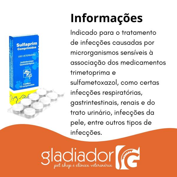 - Indicado para tratamento de diarreias, infecções de pele e feridas, infecções de ouvido, pneumonias e infecções genitais e urinárias, causadas por bactérias sensíveis ao sulfametoxazol e trimetropina, em cães e gatos.